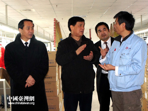 四川省臺辦主任劉俊杰在內(nèi)江市臺資企業(yè)巨騰國際有限公司考察調(diào)研。(圖片來源:四川省臺辦)