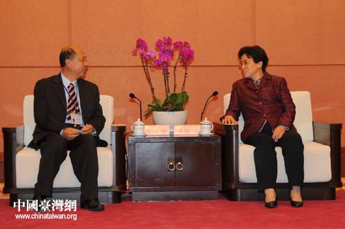 四川省委常委李登菊(右)會見全美臺灣同鄉(xiāng)聯(lián)誼會總會長鄭長祥(左)。(圖片來源:四川臺辦)