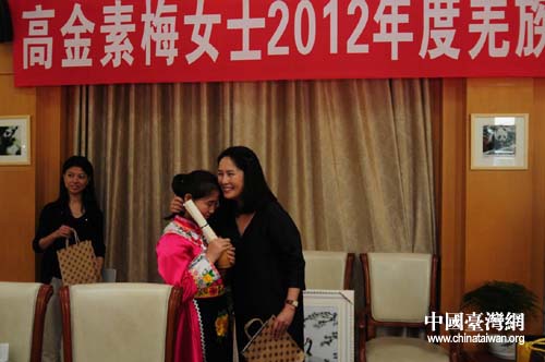 四川省臺辦副主任張軍在發放儀式上說,高金素梅女士5年來持續率臺灣少數民族參訪團來川參訪交流,為災區民眾祈福,助養北川羌族受災學生,令我們感動不已。感謝高金素梅女士在推動四川與臺灣交流特別是兩地少數民族交流、青少年交流,以及傳承和彰顯兩岸同胞友愛互助等方面所付出的心血和貢獻。前不久,成都大熊貓繁育研究基地在西部首個入選海峽兩岸交流基地,成為了四川與臺灣交流合作的新平臺,歡迎更多的臺灣同胞到四川、到成都、到大熊貓基地交流參訪,共同推動四川與臺灣的交流持續深入開展。