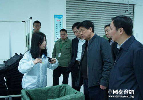 中國臺灣網3月7日成都消息 日前,四川省臺辦主任劉俊杰、巡視員鐘遠超和成都市臺辦有關負責同志等一行到成都綜合保稅區雙流園區的臺灣仁寶、緯創成都工廠調研,詳細了解、實地考察了工廠生產經營和發展情況,并就企業發展中遇到的困難和問題與雙流縣政府和企業負責人交換了工作意見。