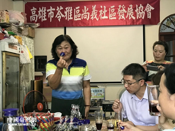 品嘗社區(qū)自制的蝶豆花茶和酵素茶。(圖片來源:綿陽市臺辦)