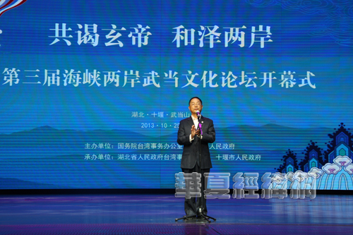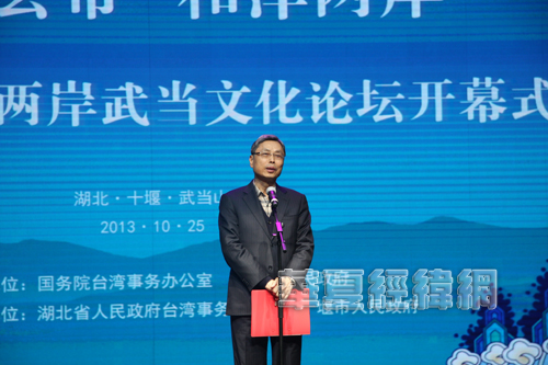 海峽兩岸關(guān)系協(xié)會副會長蔣耀平代表國臺辦、海協(xié)會對第三屆海峽兩岸武當文化論壇開幕表示祝賀!他表示,24日與海基會副董事長高孔廉先生在武漢參加了“第十屆湖北·武漢臺灣周”的開幕式,今天又來到了武當山參加海峽兩岸武當文化論壇開幕式,體現(xiàn)了湖北與臺灣在經(jīng)貿(mào)、文化、人員交流方面出現(xiàn)了可喜局面。特別是隨著兩岸各方面努力,在經(jīng)貿(mào)方面實現(xiàn)了大合作;在文化交流方面實現(xiàn)了大交流;在人員往來方面實現(xiàn)了大往來。最后,蔣耀平預祝第三屆海峽兩岸武當文化論壇取得圓滿成功!