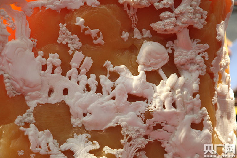 名為“走馬觀花”的壽山石工藝雕是臺灣雕刻家陳閩的作品,采用金田黃玉石雕刻而成。正濟藝術館的展商介紹雕刻這樣一件作品要半年時間,目前售價在168萬元。