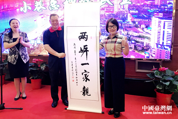 湖北書法家贈送鄧桂菊墨寶“兩岸一家親”。(中國臺灣網(wǎng) 趙苗青 攝)