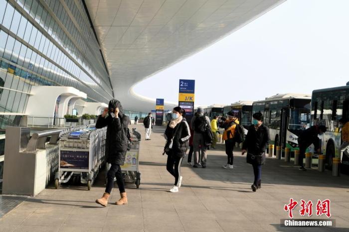 2月3日,首批約200名滯留武漢的臺胞乘坐上海航空公司的民航包機返臺。圖為臺胞抵達武漢天河國際機場準備乘機。