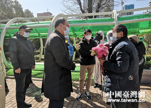 圖為湖北省臺(tái)辦主任李建紅(右一)在武漢協(xié)和醫(yī)院迎接痊愈出院的臺(tái)胞金先生(黃衣者)。(來(lái)源:湖北省臺(tái)辦)