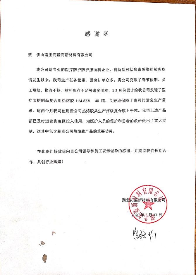 佛山日?qǐng)?bào)訊 記者劉偉 通訊員吳永升、謝坤報(bào)道 “感謝貴公司克服物流不暢、材料庫(kù)存不足等諸多困難,發(fā)運(yùn)醫(yī)療防護(hù)制品復(fù)合用熱熔膠。”“期待長(zhǎng)期合作,共創(chuàng)行業(yè)輝煌。”……3月以來(lái),佛山南寶高盛高新材料有限公司已收到十幾封感謝信,來(lái)自全國(guó)各地一些重要的防護(hù)服和手術(shù)衣面料復(fù)合企業(yè),感謝南寶樹(shù)脂在過(guò)去兩個(gè)月克服各種困難,及時(shí)足量供應(yīng)防護(hù)面料必須使用的熱熔膠材料。