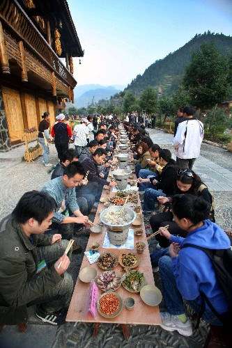11月10日,游客正在品嘗苗家長(zhǎng)桌宴。新華社發(fā)