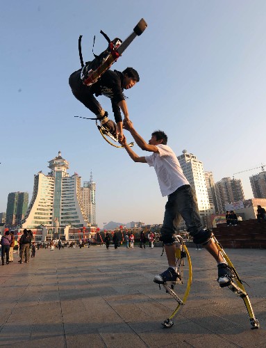 12月8日,幾名年輕人在貴陽(yáng)市人民廣場(chǎng)穿著“彈跳鞋”進(jìn)行健身運(yùn)動(dòng)。