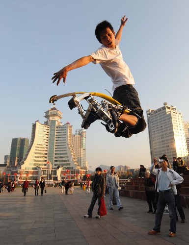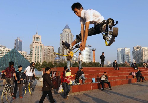 12月8日,幾名年輕人在貴陽市人民廣場穿著“彈跳鞋”進行健身運動。