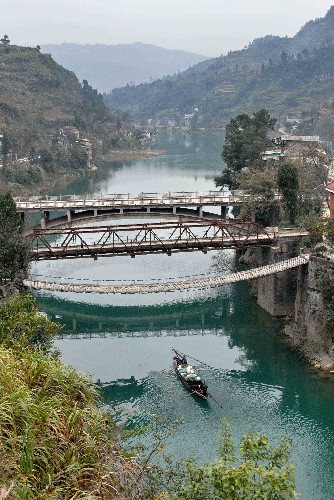 “三朝橋”位于貴州省黃平縣境內(nèi)的重安江上。第一座是清代的鐵索橋;第二座是抗戰(zhàn)時期我國著名橋梁專家茅以升設(shè)計的鋼桁橋;第三座是20世紀(jì)90年代建造的鋼筋混凝土拱橋。由于在一段相距不足百米的江面上保存有3座建造于不同歷史時期的橋梁,當(dāng)?shù)卣褜ⅰ叭瘶颉北贋槁糜尉包c。