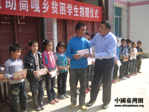 中國(guó)臺(tái)灣網(wǎng)12月8日鎮(zhèn)寧消息 日前,貴州省臺(tái)聯(lián)會(huì)長(zhǎng)邱培聲、秘書長(zhǎng)周飛月,在安順市委統(tǒng)戰(zhàn)部副部長(zhǎng)、臺(tái)辦主任趙春模、臺(tái)辦副主任帥開立的陪同下,來(lái)到鎮(zhèn)寧縣大山深處的簡(jiǎn)嘎鄉(xiāng),為這里的貧困學(xué)生帶來(lái)了臺(tái)商董淑貞女士的愛心捐款。
