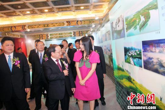 8月21日,“江西旅游風(fēng)光展”在臺(tái)北開幕。作為臺(tái)灣江西周一部分,展覽以精美的圖片向臺(tái)灣民眾介紹江西特有的風(fēng)光,期待贛臺(tái)兩地民眾互訪旅游。圖為江西省長鹿心社與其他嘉賓一起參觀展覽。黃少華攝