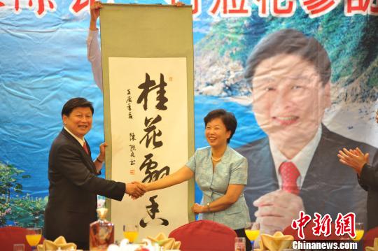 傅崐萁代表花蓮送出刻有“桂花永譽”的七彩石雕,陳際瓦為花蓮準備的恰巧是親自所書“桂花飄香”的書法作品。兩人表示,桂花二字代表兩地簡稱,這表達了他們期望廣西花蓮兩地友誼長久的美好心愿。(記者 黃少華 孫潔)