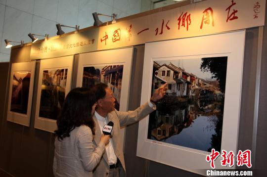 圖為臺灣中華藝術攝影家學會名譽理事長彭大利,向記者介紹“臺灣攝影家眼中的周莊”!《瓡濉z