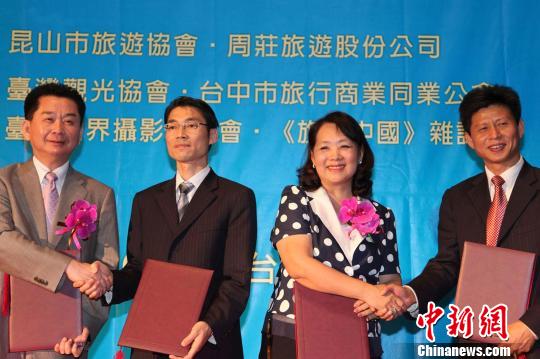 圖為昆山市旅游協會與臺灣旅游觀光協會、周莊景區與臺灣合作旅行社分別簽訂合作備忘錄!《瓡濉z
