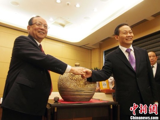 蔣孝嚴贈送彭清華鶯歌陶瓷“聚寶甕”,意寓為廣西發展“聚寶”。彭清華則回贈蔣孝嚴廣西欽州坭興陶。(完)