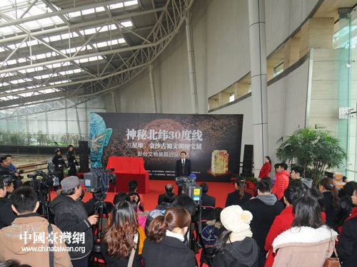 中國臺灣網12月20日成都消息 由四川省海峽兩岸交流促進會、四川省文物局和臺灣新光三越文教基金會、新光三越百貨有限公司主辦,金沙遺址博物館和三星堆博物館協辦的“神秘北緯30°線——三星堆、金沙古蜀文明秘寶展”即將在臺北拉開帷幕。12月20日,赴臺文物裝箱啟運儀式在成都市舉行。