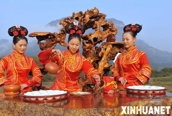 11月16日,三位姑娘在風光秀麗的武夷山大王峰下表演茶藝。 當日,第二屆海峽兩岸茶業博覽會在福建武夷山拉開帷幕。海峽兩岸6000多名茶商、茶農以及茶業專家相聚武夷山下,以茶會友,共敘親情,以一脈相承的茶文化為橋梁和紐帶,拓寬旅游、經濟等領域的廣泛合作,推動兩岸經濟文化繁榮。 新華社記者張國俊攝