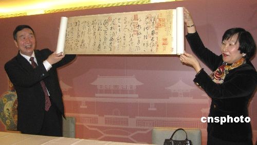 3月2日下午,臺(tái)北故宮博物院與北京故宮博物院代表在臺(tái)北故宮博物院,就2月15日雙方在北京達(dá)成的共識(shí)舉行進(jìn)一步會(huì)談,并在會(huì)后召開記者會(huì),發(fā)表落實(shí)合作交流方案,雙方同意在不涉及名稱載示及法令之前提下,進(jìn)行8項(xiàng)實(shí)質(zhì)性合作。圖為北京故宮博物院院長鄭欣淼(左)和臺(tái)北故宮博物院院長周功鑫(右)在展示臺(tái)北故宮贈(zèng)給北京故宮的唐代懷素《自敘帖》的高仿復(fù)制品。 中新社發(fā) 路梅 攝