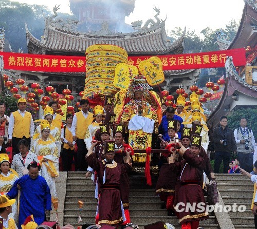 中新社湄洲島十一日二日電 (詹托榮)今天上午,湄洲媽祖金身開始在“媽祖故鄉(xiāng)”福建莆田繞境巡安,臺灣鹿港天后宮媽祖神像隨駕參加,世界各地文化機構、信眾代表和當地群眾數萬人或護駕、或沿路朝拜,隊伍浩大、場面壯觀。