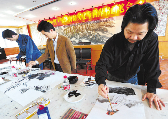 圖為海峽兩岸書畫家現場潑墨揮毫。