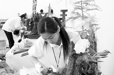 學(xué)生在進行藝術(shù)插花競賽