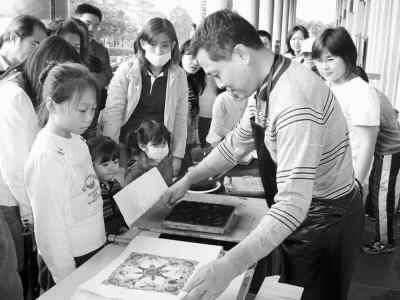 和善的馬習(xí)欽教得特別認真。他先給練習(xí)制作的孩子系上圍裙,然后教他們對版、套版、刷版,爾后,一張色彩明亮、透著喜氣的胖娃娃年畫就這樣印出來了。孩子們學(xué)得興致勃勃,也吸引了一些大人前來一試身手。