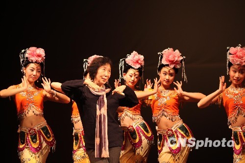 西北民族大學舞蹈學院教授、國家一級編導高金榮率該學院師生來臺獻藝,將與臺灣敦煌能量藝術研究會的業余舞蹈演員共同演出《妙音反彈》、《彩虹》、《大飛天》、《千手觀音》等舞作。圖為十二月九日舉行的記者會上,高金榮(左二)指導師生表演。中新社發 曾嘉 攝