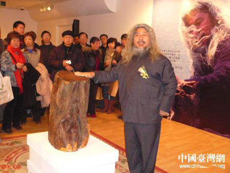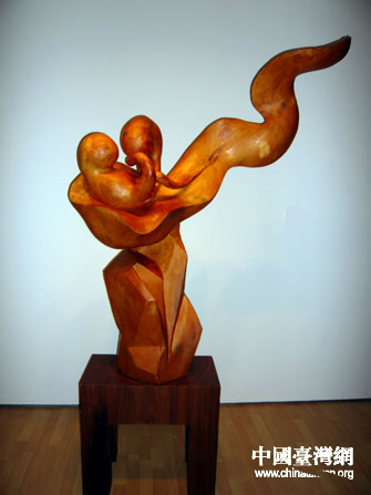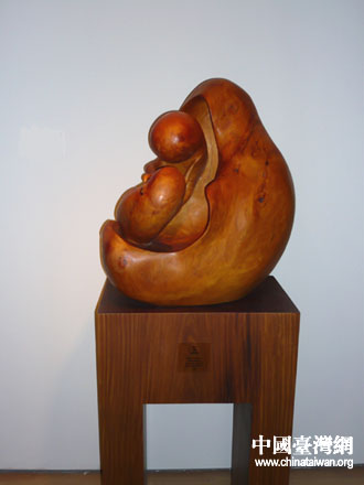 開幕式上,康木祥為來賓介紹了用紅檜、梢楠、牛樟等木材雕刻而成的“圣嬰”、“向上”、“深情”、“母子”、“良緣”等作品。這些作品雖形態(tài)各異,但有一個共同特點,就是充分利用樹木的形狀、裂縫、紋理,盡情展示生命的最初形態(tài)和原始美感。在介紹到作品“包容”時,康木祥說,這是他迄今為止難度系數(shù)最大的一件作品,在創(chuàng)作過程中,手被敲傷、割破多次。說這番話時,他的臉上露出淡然的微笑。