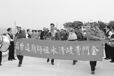 東南網-福建日報1月19日訊 16日,金門烈嶼青崎清水祖師宮理事會會長洪大偉率領100名信眾到翔安清泉巖進香。金門烈嶼青崎清水祖師宮是翔安清泉巖的分爐,共同供奉清水祖。自2006年以來,青崎清水祖師宮已經連續6次組團到清泉巖進香,清泉巖腰鼓隊也于2008年10月16日赴金門清水祖宮表演,進行兩岸法事交流。(林世雄 黃彩虹 張天驕 攝)