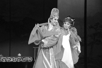 臺灣劇團在文化節上演岀《唐伯虎點秋香》,受到觀眾熱烈歡迎。圖為扮演唐伯虎的臺灣歌仔戲劇團許亞芬團長(左)在演岀中。