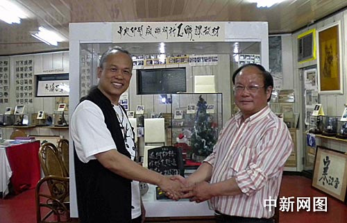 杭州蕭山天石微雕館館長馮耀忠(右)近日訪問臺灣,與臺灣著名微雕家陳逢顯(在)在陳逢顯毫芒雕刻館合影交流。陳文 攝