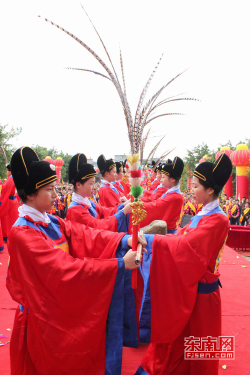 在現場,不僅僅有太平鼓、惠安禮鼓等民間文化展示,40多位年輕女子還集體跳起了"六佾舞",成為一大亮點。她們左手執龠、右手秉翎,在優雅古樂中翩翩起舞。"王審知為了百姓而不做閉門天子,中原王朝給他的封號是王爵,因此祭祀時跳的是'六佾舞'而不是天子的'八佾舞'。"祭祀策劃人員鄭煒說,"這些祭祀細節,都是為了遵循王審知的愛民思想。"