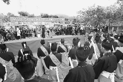 23日上午10點,福州市晉安閩臺王審知研究會會長王大盛宣布大典開始,鳴放禮炮。兩岸宗親代表在主祭官王珠慶先生的帶領下開始祭祀典禮(上圖)。盥洗上香、獻爵奠酒、行初獻禮、恭讀祝文、行亞獻禮、行終獻、飲福受胙、焚帛望瘞、辭神。整個祭祀過程展現了中華傳統的祭祀禮儀。