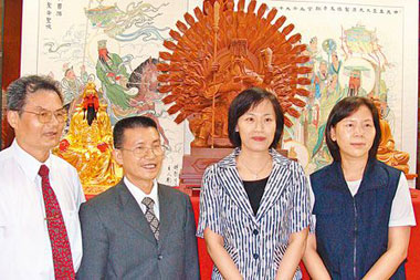 臺灣關公文化節人文藝術展27日將在桃園縣府與文化局同時展出,圖后方的木雕名為“千百億化身”,集合海峽兩岸10多位名師雕刻,有108只手,各執法器與兵器。 圖片來源:臺灣《中國時報》