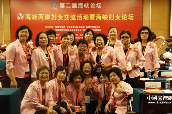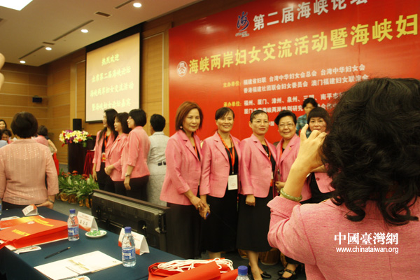 兩岸婦女代表們在大會背景板前選取各種角度合影留念。(中國臺灣網(wǎng) 李桂英 攝)