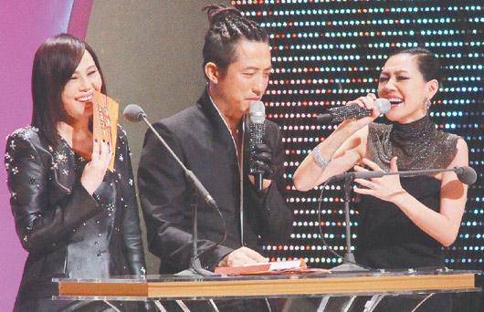 金曲獎主持人庾澄慶(中)、小S(右)與閩南語天后江蕙(左)頒發最佳年度歌曲。圖片來源:臺灣《聯合報》