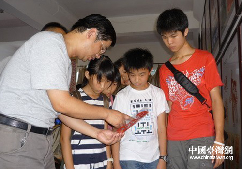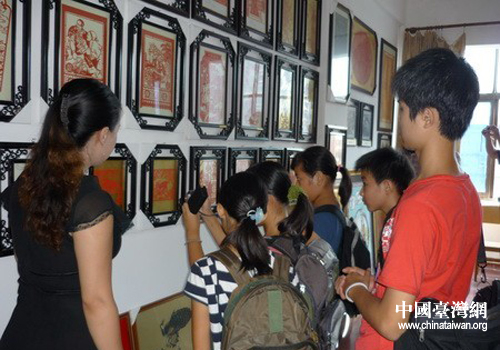 中國臺灣網7月29日孝感消息 日前,來自臺灣的五名小朋友到湖北孝感市雕花剪紙研究所參觀雕花剪紙工藝。臺灣小朋友們興致勃勃的參觀了剪紙工藝品展覽,對中華民間藝術的博大精深無比贊嘆。