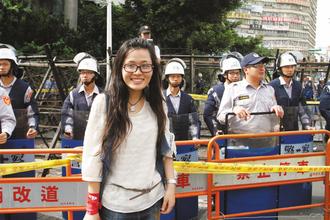 到了臺灣,街頭民主一定要見習一下的啦!抗議的紅色布條在右手綁成手環,來自南京的黃艷梅,美美地跟臺灣警察合影留念一下吧。陳柏亨攝影