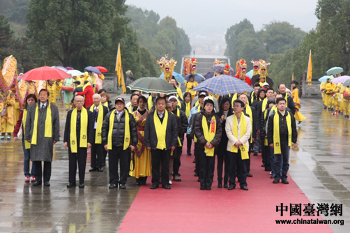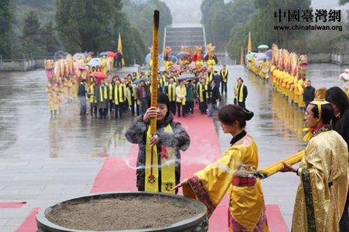 在全體肅立、擊鼓九通、鳴金九響、鳴炮奏樂、敬獻貢品(三牲、五谷、時鮮)后,湘籍后裔、臺北市議員黃珊珊作為主祭人向中華民族始祖炎帝虔誠敬香、敬獻花籃并三鞠躬。黃珊珊深情地宣讀了祭文,一句“湖湘子弟情系兩岸”感動了在場所有嘉賓。之后,臺灣嘉賓前往謁陵廣場舉行開午門謁陵儀式。
