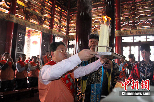 12月20日,位于泉州鬧市的元妙觀熱鬧非凡,由臺灣彰化市市長邱建富率領的臺灣彰化元清觀朝圣團前來祖庭進香分靈。郭斌 攝