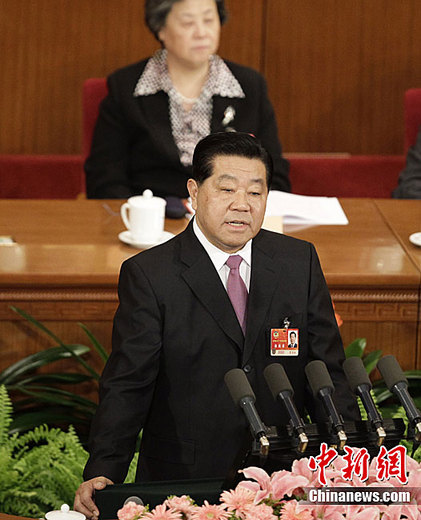 3月3日下午3時,全國政協十一屆四次會議在北京人民大會堂開幕。圖為全國政協主席賈慶林代表政協第十一屆全國委員會常務委員會作工作報告。中新社記者 盛佳鵬 攝