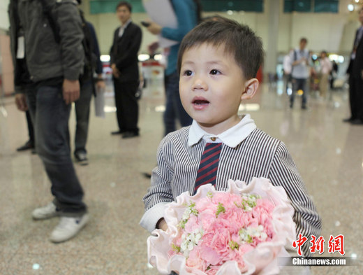 2011年5月2日,大陸著名歌唱家宋祖英抵達(dá)臺(tái)北,將于5月8日在臺(tái)北小巨蛋舉行“宋祖英2011臺(tái)北小巨蛋演唱會(huì)”,并與臺(tái)灣歌手周杰倫、周華健同臺(tái)演出。圖為在機(jī)場(chǎng)等待宋祖英到來(lái)的小“粉絲”。中新社發(fā) 路梅 攝