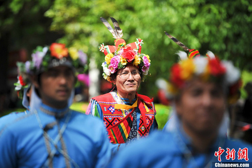 4月30日,2011中國昆明國際文化旅游節(jié)昆明狂歡節(jié)在春城昆明開幕。來自寶島臺灣的原住民族原舞者表演隊精彩亮相,受到游客的喜愛。中新社發(fā) 劉冉陽 攝