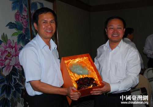 鞍山市副市長(zhǎng)王忠哲向臺(tái)灣客人贈(zèng)送禮品