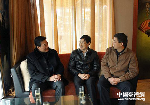 綿陽(yáng)市政協(xié)副主席胥躍東(中)、綿陽(yáng)市臺(tái)辦主任陳福林(右)與張道禎理事長(zhǎng)(左)親切交談。(圖片來(lái)源:綿陽(yáng)市臺(tái)辦)