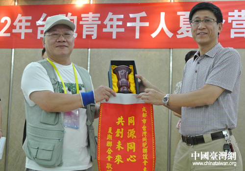 臺灣夏潮聯合會領隊向臺聯贈送“同源同心 共創未來”錦旗。(圖片來源:四川省臺聯)