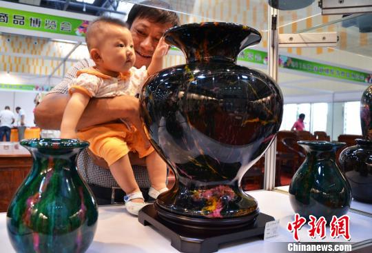 由新疆旅游局和克拉瑪依市人民政府主辦的首屆旅游商品博覽會10日在此間拉開序幕,圖為新疆民眾帶著孩子觀看臺灣名石七彩玉制作的器物。孫亭文 攝