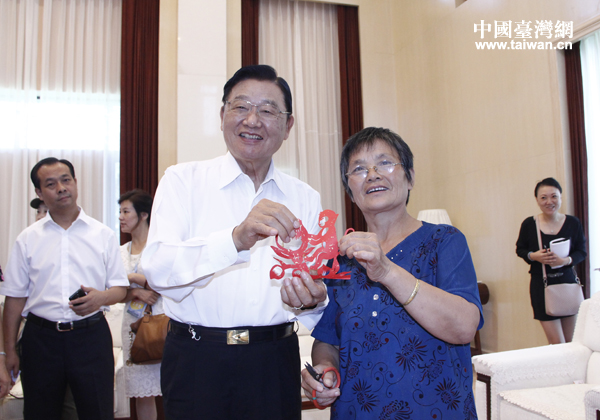 23日,首屆兩岸和諧家庭合唱節在遼寧省鐵嶺市隆重開幕。臺灣三三會會長、前;鶗麻L江丙坤率團參加活動。圖為江丙坤在參觀民間剪紙藝術時獲鐵嶺市非遺產文化傳承人,有名的剪紙藝人艾玉芹贈送寓意好運的福猴抱桃剪紙貼畫。(中國臺灣網 普燕 攝)